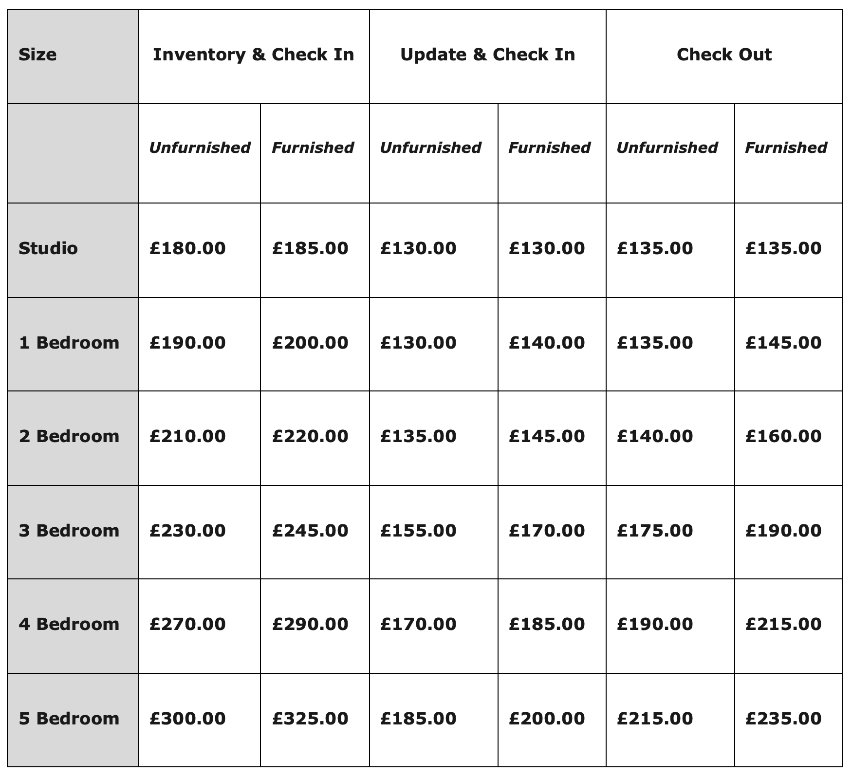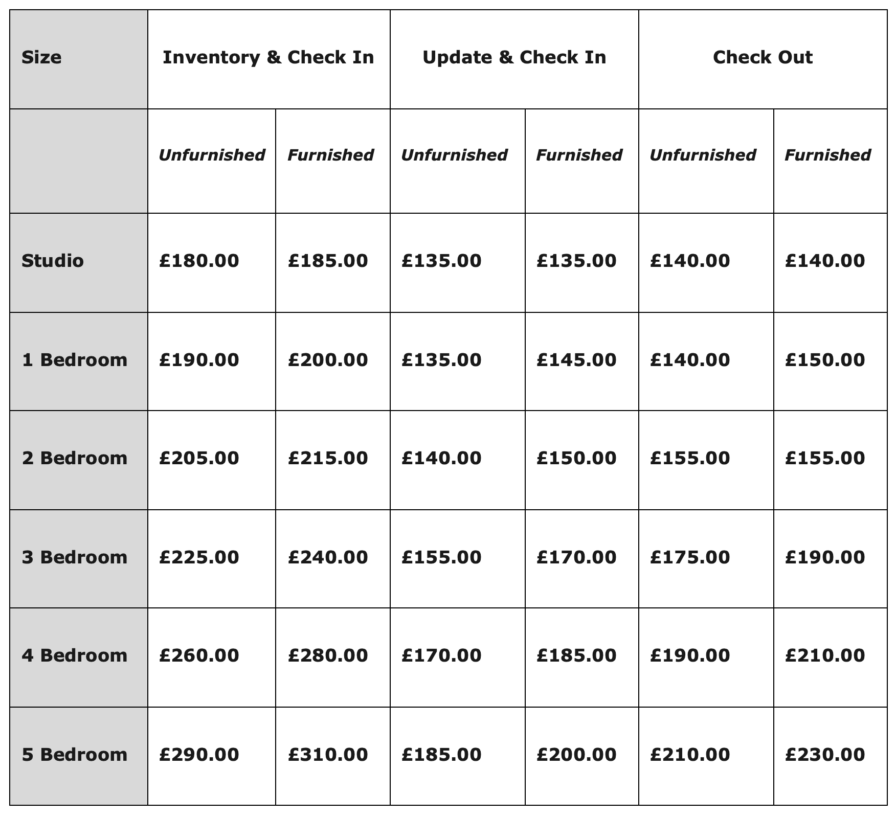 Heavily furnished properties and properties left in poor condition at check out requiring additional time will incur additional charges